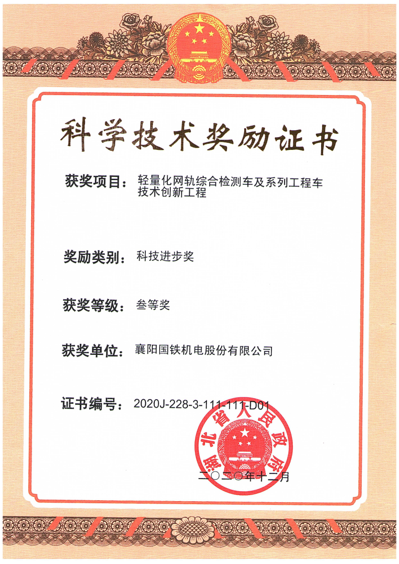 湖北省科技進(jìn)步三等獎(jiǎng) 輕量化網(wǎng)軌綜合檢測(cè)車及系列工程車技術(shù)創(chuàng)新工程