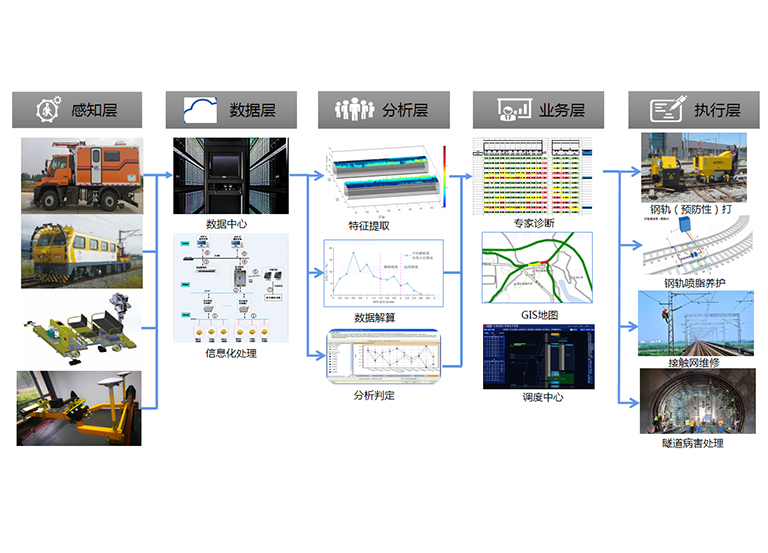 源自不同的智能檢測裝備的數(shù)據(jù)經(jīng)過數(shù)據(jù)中心整理、歸并、解算,生成過程性分析數(shù)據(jù)和直觀的判斷結(jié)果,最終對(duì)線路狀況提供運(yùn)營維保的建議和意見。
